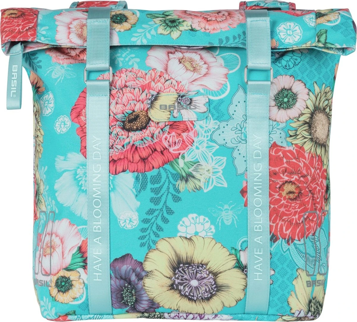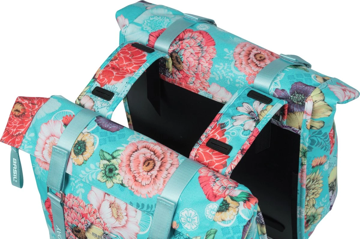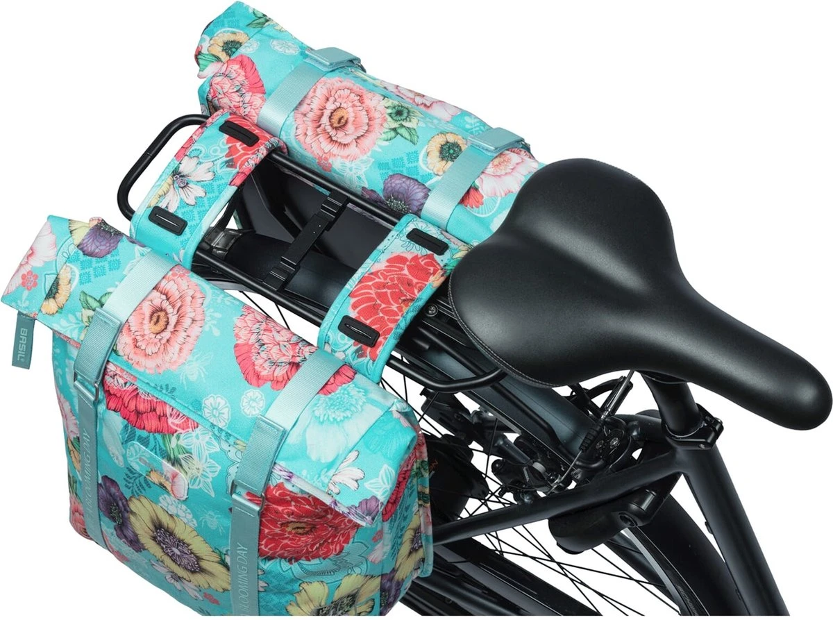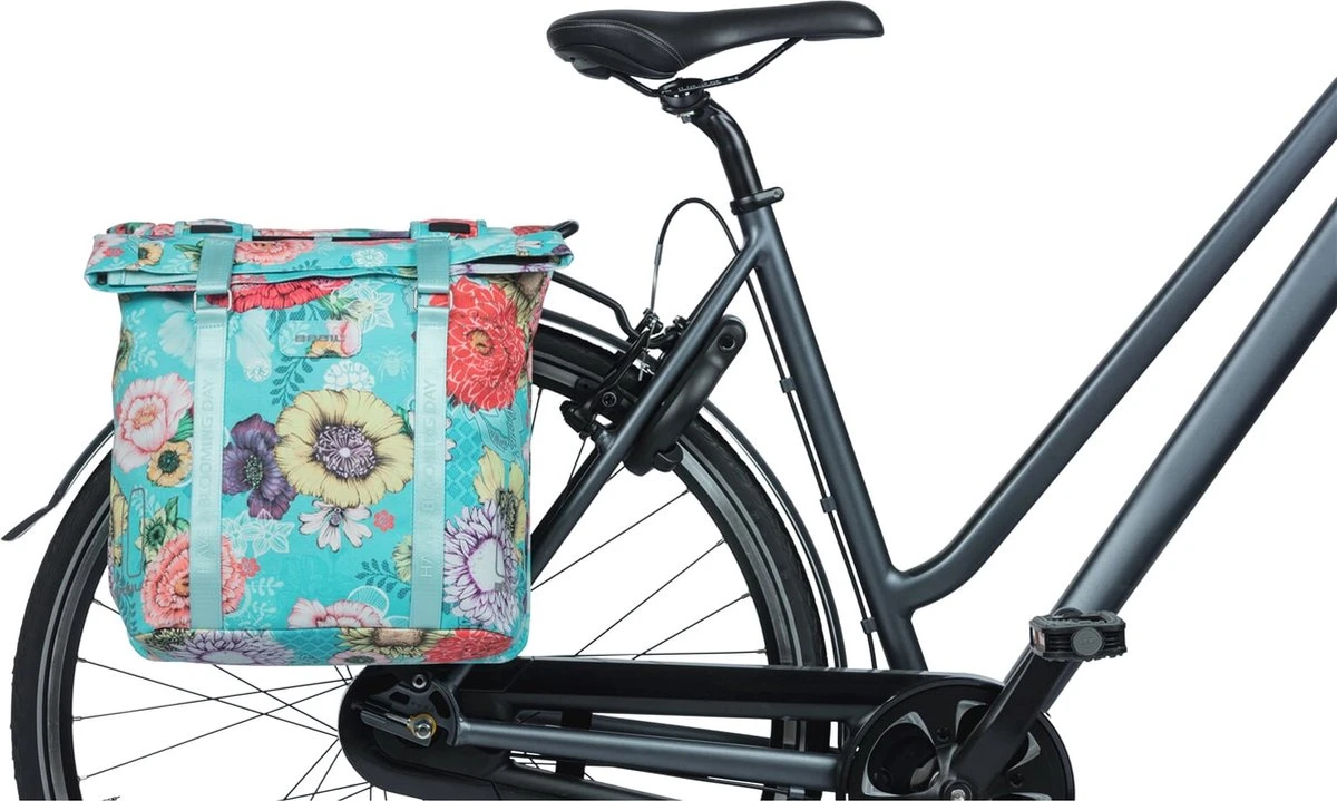 De Basil Bloom Field dubbele fietstas is geschikt voor achterop een damesfiets en valt op dankzij de vrolijke print en blauwe kleur.