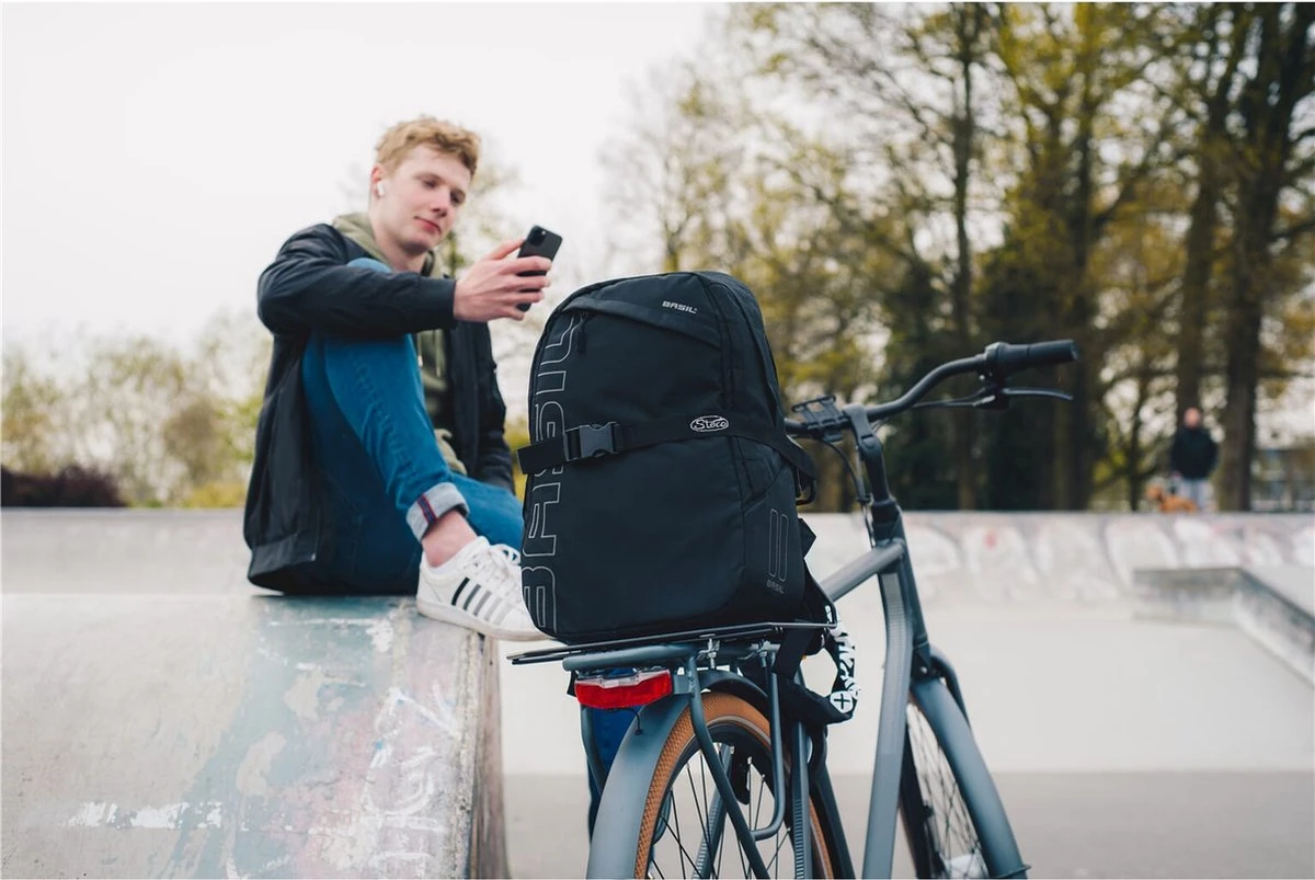 Ben je op zoek naar een rugzak, maar heb je geen zin in een bezwete rug? Dan is de Basil Flex fietsrugzak de uitkomst! Met het Hook-On systeem haak de tas gemakkelijk aan je bagagedrager. Ook op een elektrische fiets. Doordat je de tas aan je bagagedrager meeneemt, voorkom je dat je zweterig op je bestemming aankomt. En omdat het gewicht van de tas een stuk lager zit, fiets je veel stabieler (en daarmee veiliger). Wel zo fijn! De Flex backpack is gemaakt van hoogwaardig polyester en heeft een modern design. Ga je sporten? Neem de Flex mee. Naar het werk? Haak de fietsrugzak aan je bagagedrager. Voor elk moment van de dag geschikt. De tas is gemaakt van hoogwaardig polyester en heeft gewatteerde schouderbanden en achterpand. In het voorvak met rits en een extra ritsvak heb je jouw belangrijke zaken altijd bij de hand. De reflectie op de tas (en de bevestigingsmogelijkheid voor LED-verlichting) zorgen ervoor dat je beter zichtbaar bent. Eigenschappen: De ruime fietsrugtas draagt heerlijk comfortabel dankzij gewatteerde schouderbanden. Met het Hook On-system bevestig je deze rugzak snel achterop de fiets. Reflecterende delen op de tas zorgen voor extra zichtbaarheid in het donker. Sleutels en bijvoorbeeld een telefoon stop je veilig weg in de ritsvakken van deze tas.