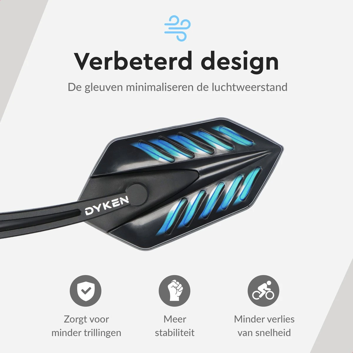 Slimme gleuven in de achterkant minimaliseren de luchtweerstand. Zo blijft de achteruitkijkspiegel stevig op je stuur zitten en zal ‘ie tijdens het rijden minder trillen.