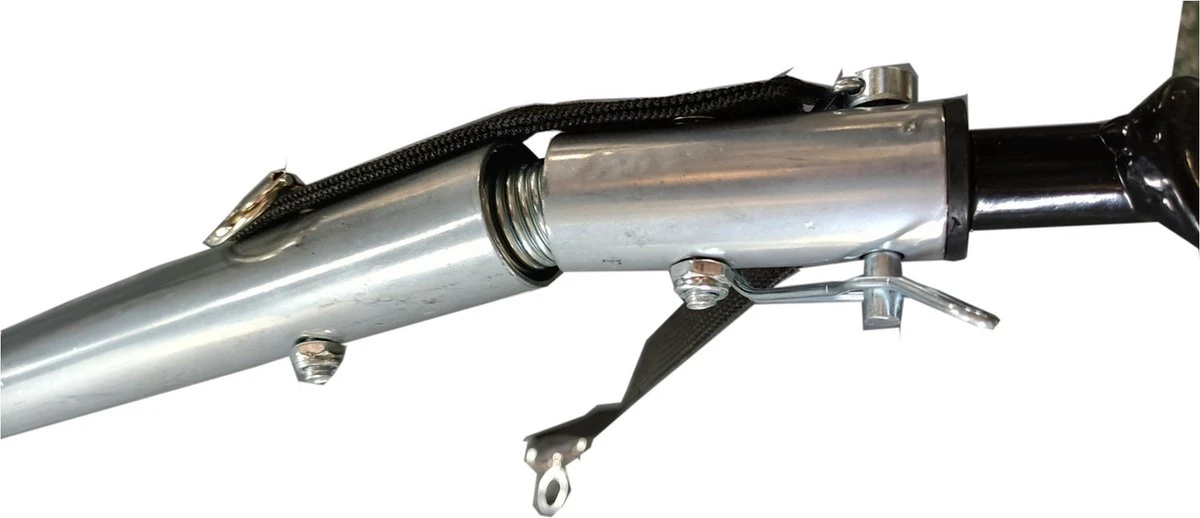 De duwstang is voorzien van een foam handvat voor een stevige grip en is eenvoudig in hoogte te verstellen. Verder is deze ook voorzien van een effectieve rem die de twee grote wielen blokkeert.