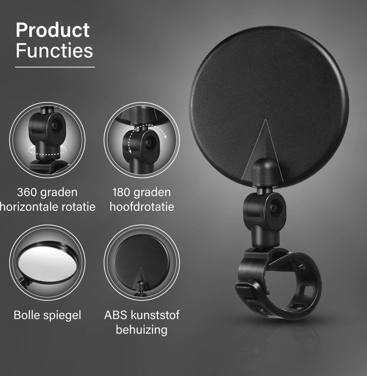 Neemt weinig moeite in beslag om op je fiets te monteren, door het handige ophang systeem zet je de spiegel eenvoudig op de juiste plek waardoor je alles achter je kan zien. - 360 ° Verstelbaar