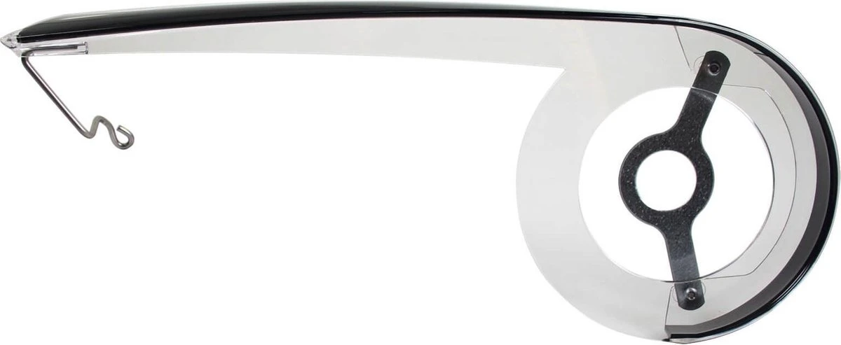 Hesling kettingscherm “Cambio” in presentatieverpakking. Wordt gebruikt op o.a. Koga / Batavus / Sparta. Eigenschappen: 1-vleugelig Kunststof Incl. toebehoren Voor crankbladen tot 46 tanden Totale Lengte: 49 cm Hoogte: 22 cm Diameter Crankgat: 16 cm Diepte: 42 mm Transparant met zwarte afdekrand