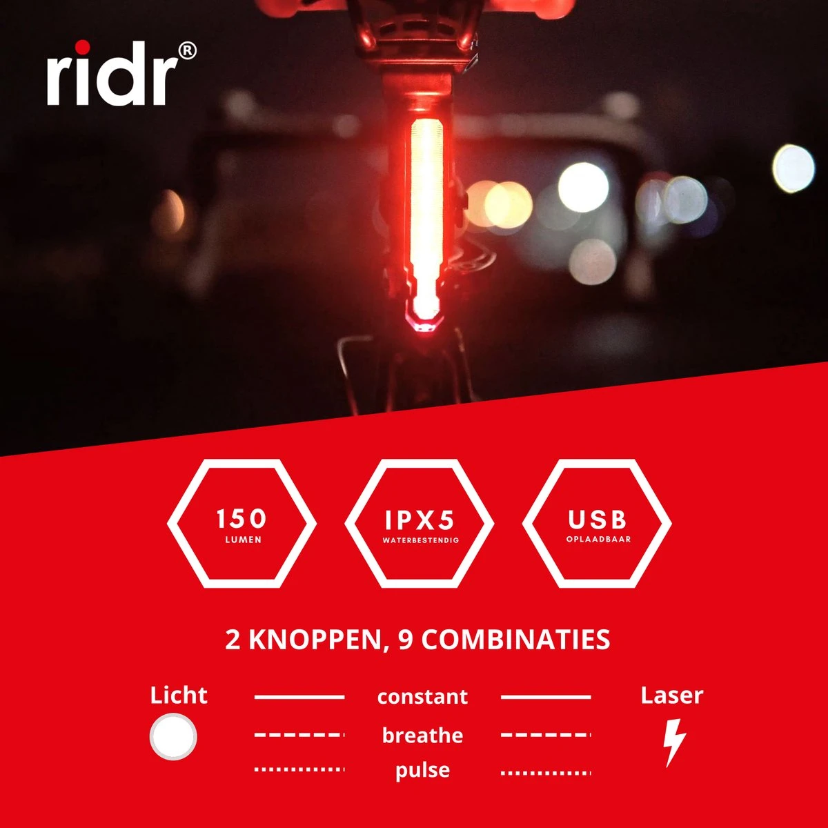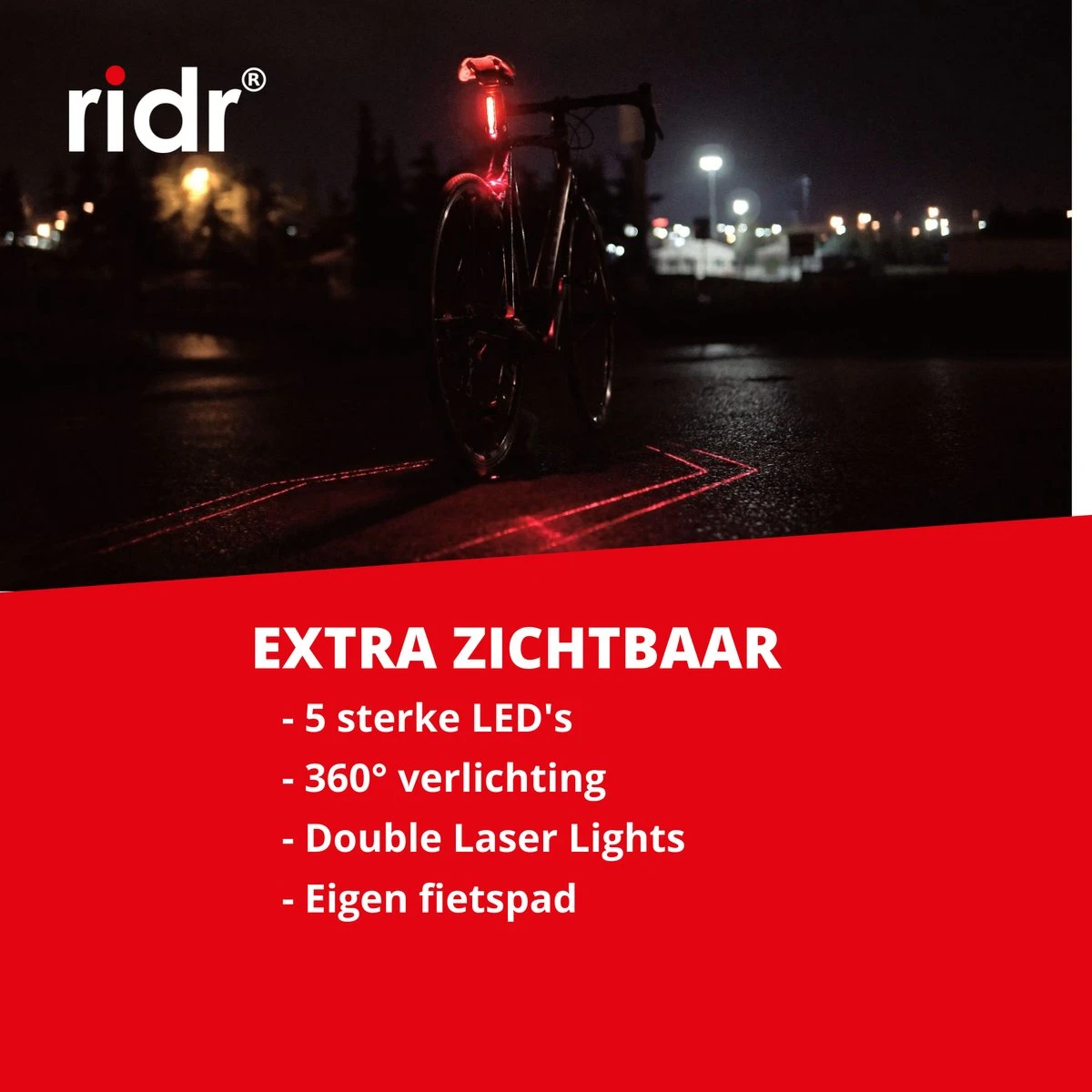 RIDR Lights is een revolutionair 2-in-1 fietslicht. Met 5 sterke LED’s en 2 extra Laser diodes geniet je van maximale zichtbaarheid op de baan. De Laser Lights vormen een dubbel patroon op de grond om auto’s op een veilige afstand te houden en beter zichtbaar te zijn voor het verkeer. Met RIDR Lights neem je je veiligheid in eigen handen!